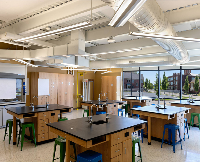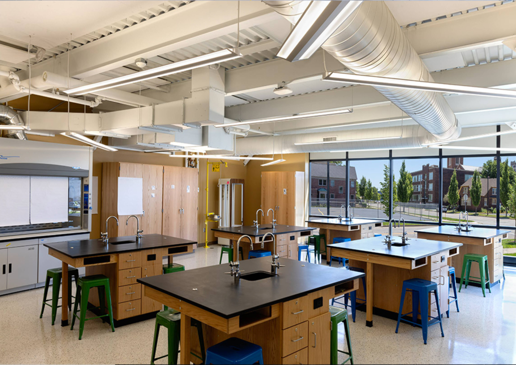 Panzica has been privileged to design and build every facility for the Career Academy Network of public schools, starting with our award-winning design of their initial facility in 2011. Most of these have been challenging, fast-paced adaptive reuse projects, enabling the system to continue rapidly growing with the kind of flexible and innovative educational spaces that are its hallmark. This latest project, a new high school known as The Portage School of Leaders, was by far the most challenging to date.